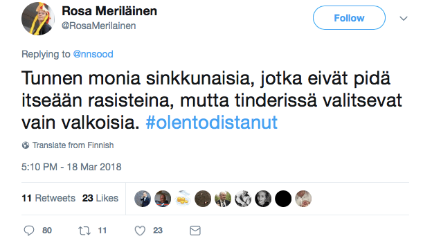 Antakaa kun selvennän. On suorastaan oikeamielistä olla sitä mieltä, että se kenen kanssa harrastaa seksiä tai on romanttisessa suhteessa, ei kuulu kenellekään toiselle. Tämä on ihmisoikeus. Miksi Tinderissä tietyn etnisen alkuperän preferoiminen eroaa tästä ihmisoikeudesta? Itse asiassa Tinderissä se on vielä hyväksyttävämpää kuin esimerkiksi ravintolassa tai baarissa. Kukaan ei näe kenen profiilin svipeät vasemmalle. Ravintolassa ja baarissa jokainen pois käännetty katse tulee huomatuksi. Eikä siinäkään ole mitään väärää. Sosiaalisissa tilanteissa paitsioon jääminen on yksi valitettava vaihtoehto.