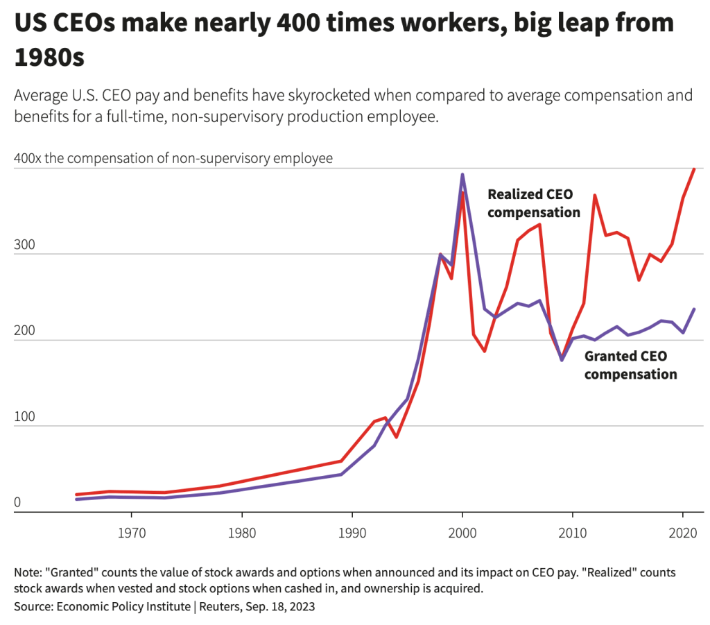 Hyvänä esimerkkinä meritokratiasta voidaan mainita, miten toimitusjohtajien palkka on muodostunut Yhdysvalloissa viimeisten 40 vuoden aikana. Vuonna 1984 toimitusjohtaja ansaitsi keskimäärin 46.2 kertaa tyypillisen rivityöntekijän palkan verran ansioita vuodessa. Nyt tämä suhdeluku on 400 kertainen rivityöntekijään verrattuna (lähde: US CEOs make nearly 400 times workers, big leap from 1980s (Reuters)). Onko toimitusjohtajan työntuottavuus todellakin melkein kymmenkertaistunut rivityöntekijän tuottavuuteen nähden? Tuntuuko tämä oikeudenmukaiselta?